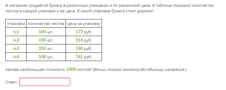 В магазине продаётся бумага в различных упаковках и по различной цене. В таблице